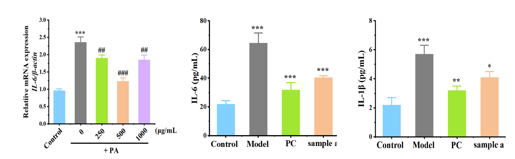 與模型組相比,加入樣品后炎癥因子含量和基因表達明顯下降,表明樣品具有一定的抗炎修護功效。