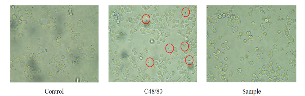 皮膚在外界環境刺激下,會激活肥大細胞進而引起其活化、脫顆粒等情況。通過C48/80誘導肥大細胞活化脫顆粒,使用樣品后脫顆粒數量明顯減少,表明樣品具有良好的舒緩功效。