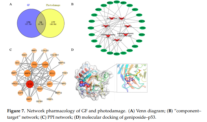 蛋白質(zhì)組學(xué)與網(wǎng)絡(luò)藥理學(xué)結(jié)合:通過DIA定量蛋白組技術(shù)發(fā)現(xiàn)G2/M檢查點(diǎn)等梔子抗光損傷關(guān)鍵靶標(biāo);運(yùn)用網(wǎng)絡(luò)藥理學(xué)分析鎖定TP53/IL1B/MMP9等核心靶點(diǎn);創(chuàng)建梔子苷-p53分子對(duì)接驗(yàn)證,為梔子提取物抗光損傷機(jī)制研究提供多組學(xué)交叉驗(yàn)證范式。